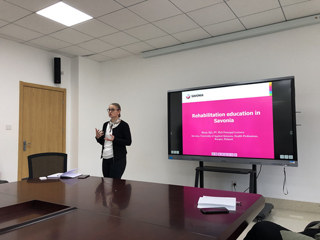 11月2日,芬兰萨沃尼亚应用科学大学健康学院物理治疗治疗系教授Marja做客康复学院,为学院教师带来了一场题为《Rehabilitation education in Savonia》精彩的讲座。王红院长主持讲座。