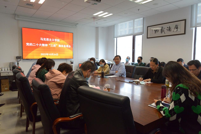 2022年10月26日,马克思主义学院开展党的二十大精神“三进”集体备课会,全体教师积极参加,热情讨论。会议由马克思主义学院院长孙玉良教授主持。会议主要分两个环节进行:一是不同教研室对已开展的集体备课情况汇报交流;二是教师代表性的学习体会展示与共享。