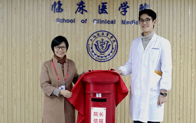 揭幕仪式后,来自17级临床本科班的学生代表在班导师的见证下,将同学们写给三年后的自己的一封信投入院长信箱中。学生代表张辰雨上前朗读他写给未来的自己的信,信中提到“这封写给三年后的自己的信,不仅是对未来的展望,更是对学习的敦促,对初心的考验。希望三年后的自己能不忘初心,学有小成。”