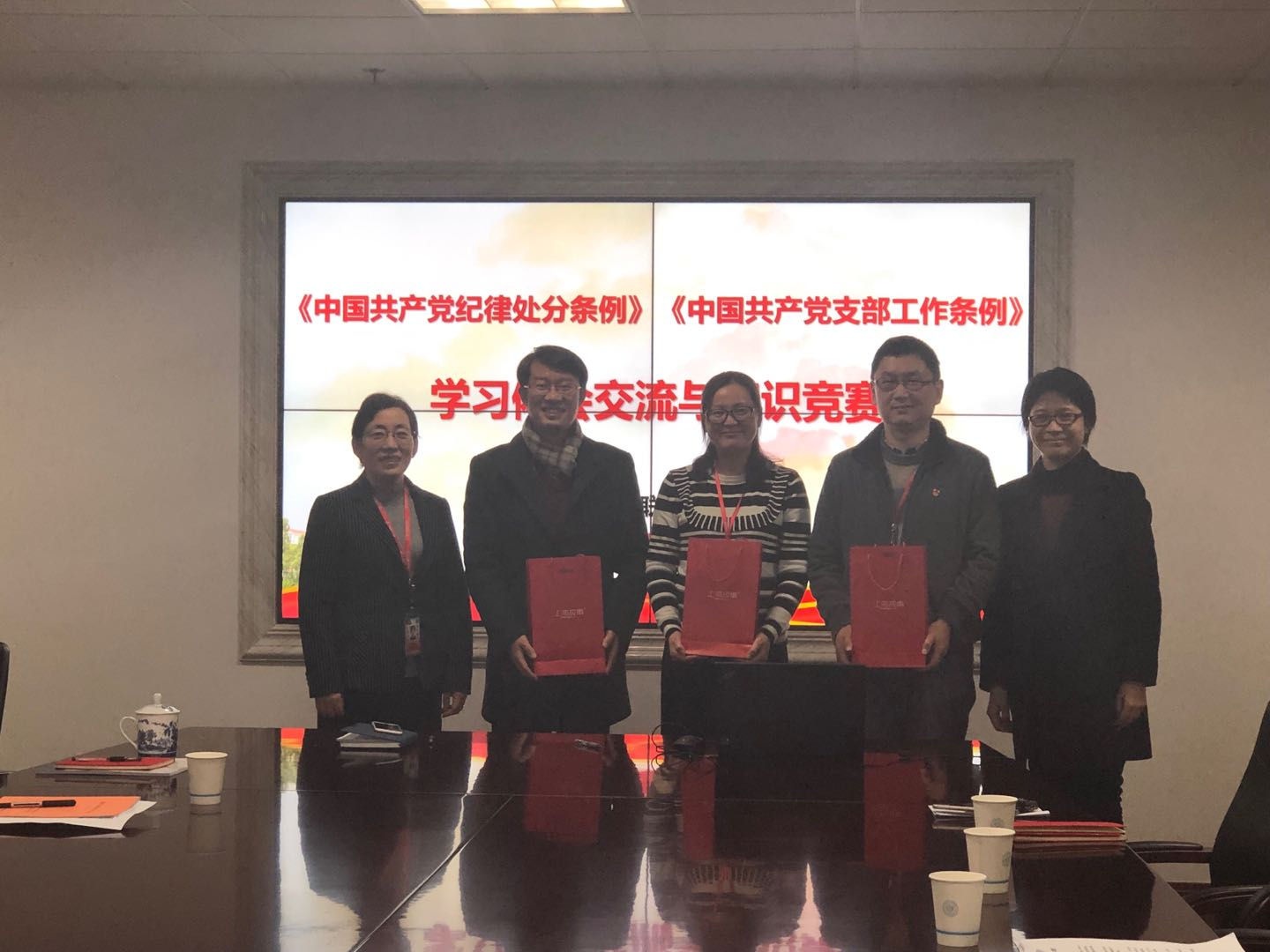 本次主题教育月活动分为三个环节:自学环节、聆听辅导报告环节和现场交流竞赛环节。为便于党员自学,党支部在月初给每位党员配发“两部条例”。12月17日,利用学校党委中心组扩大学习,组织全体党员聆听了上海市委党校袁峰教授的专题辅导报告《最新党规解读》。为了检验党员的学习效果,党支部于12月27日开展了学习成果交流和知识竞赛。在学习成果交流环节,支部党员郑沈芳、郑学文、施奇、蒋瑛英、陈国庆、杨雯等同志结合各自岗位,交流了学习体悟和思考。在知识竞赛环节,支部书记郑学文设置了判断题和简答题两种题型,采用举手抢答的形式,组织全体党员竞相答题。现场抢答踊跃,气氛活泼,蒋瑛英、施奇、解晓峰三位党员表现出色,获得前三名。