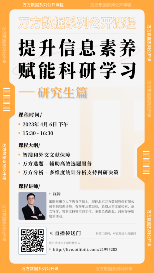 凛冬散尽,暖风和煦,伴随着春天的脚步,我校图书馆联合万方数据库特别推出“提升信息素养,赋能科研学习”系列线上直播讲座,将从平台简介、资源介绍、终端应用等多个维度,帮助大家更好的利用万方数据知识服务平台的资源,提升用户在精准发现、获取与分析、沉淀学术信息等方面的能力,助力科研论文、学术论文的撰写,促进科技创新、拓展发现新领域。欢迎我校师生积极参与。