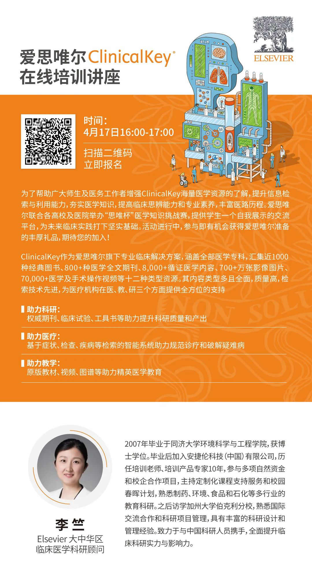 为了帮助医学专业人士增强ClinicalKey海量医学资源的了解,提升信息检索与利用能力,夯实医学知识,提高医学科研效率,辅助临床工作。我们邀请爱思唯尔大中华区临床医学科研顾问——李竺博士,开展ClinicalKey在线培训讲座。