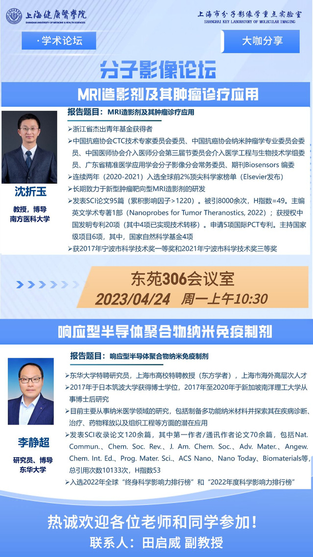 学术沙龙:MRI造影剂及其肿瘤诊疗应用;响应型半导体聚合物纳米免疫制剂