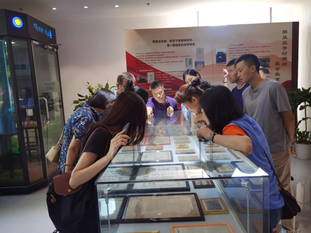 在医学名画空间,来访者一边聆听医学故事,一边欣赏百来幅医学名画,有趣的医学故事串起了一部医学发展史。“阅读”一幅幅精美的名画,读出的是医者的悲悯之心和大爱之情,是医学严谨和创新的科学精神。之后,来访者参观了红色医学教育主题展,了解中国共产党医疗卫生工作自初创时期以来的发展历史,重温医学教育发展的艰辛时刻。其实,我国红色医学教育的发展历史与军事科学院、国防大学颇有渊源,其中介绍的不少历史人物和事件都和两个单位相关,参观过程中,来访人员也介绍了很多展览之外相关的历史和故事,这种互动让此次展览参观变得生动有趣,内容更加丰富。