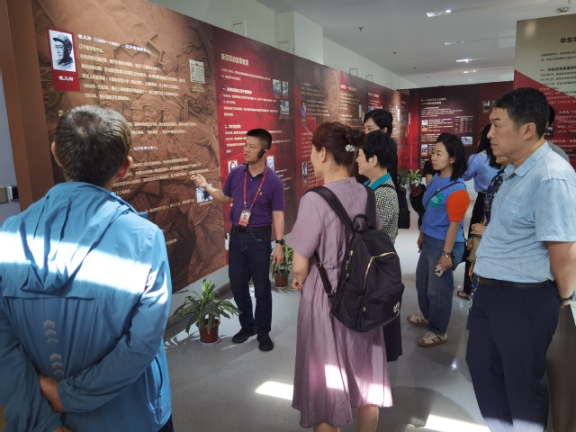 彭骏首先就我校图书馆建设情况向来访者做了简要介绍,重点介绍了图书馆在医学人文教育方面的探索和创新做法。近年来,图书馆积极践行“人文+实践”医学生培养理念,充分发挥自身资源优势,以凸显医学人文精神的各类文化活动为载体,积极参与“馆”“展”“剧”健康新叙事实践,有效进行医学人文教育与传播。之后,在彭骏带领下,来访者先后参观了位于南苑图书馆的医学名画空间和红色医学教育主题展。