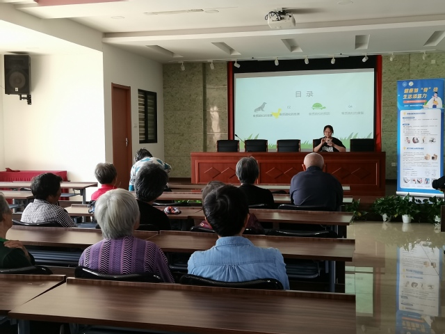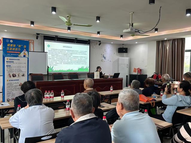 讲座中,志愿者从骨质疏松症的概念入手,以通俗易懂的语言,生动详实的例子,耐心讲解骨质疏松的发生发展过程,并就骨质疏松的原因、老年人骨质疏松的主要表现和危害、以及各种类型的常规治疗手段等进行深入讲解。告知老年朋友们,健康骨骼对保证自身健康和生活质量的重要意义,要养成良好的生活习惯,践行健康的生活方式,发现问题及时治疗,筑牢健康防线。在讲座后,志愿者们带领老年人进行了手指操练习并提供测量血压的助老服务。
