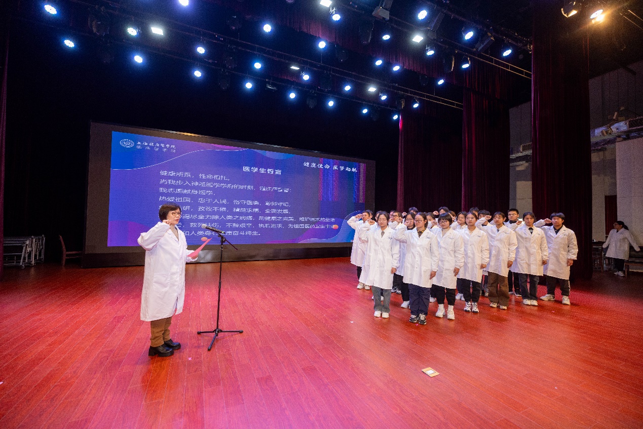 在蔡巧玲的带领下,医学生们右手握拳,以积极昂扬的精神面貌,庄严宣誓医学生誓言。铿锵誓言久久回荡,表达了医学生们献身医学的决心,坚定的理想信念,不忘初心,共同传承“敬佑生命、救死扶伤、甘于奉献、大爱无疆”的医学职业精神。