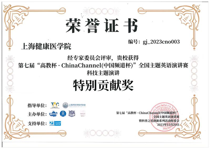 近日,在刚刚结束的第七届“高教杯 ChinaChannel”全国主题英语英语演讲赛中,我校健康与公共卫生学院学生任轶琪、医疗器械学院学生李文雯、护理与健康管理学院学生施宇帆、庄楠等参赛选手获得全国个人赛道及文案赛道二、三等奖佳绩,我校外语教学部李悦、阮俊斌、沈军等教师被授予“科技主题演讲创新指导奖”称号,并获得主办方颁发的“科技主题演讲特别贡献奖”。