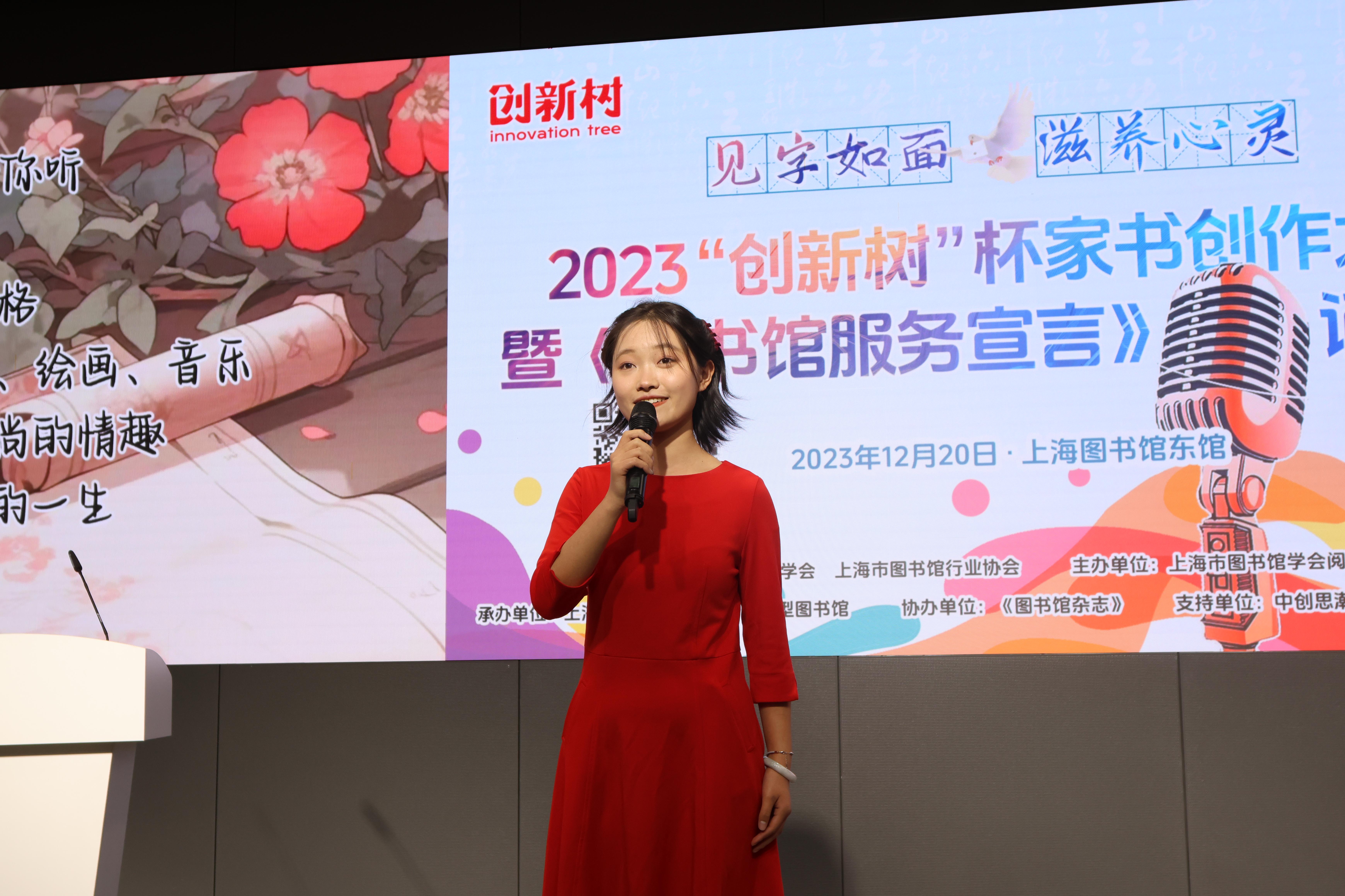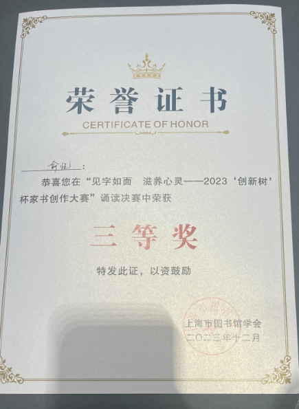 12月20日下午,2023“创新树”杯家书创作大赛之“家音频传”家书诵读总决赛和颁奖典礼在上海图书馆东馆举办,我校选手俞悦的诵读作品《写给未来的自己》斩获三等奖,香港六宝典免费大全图书馆荣获最佳组织奖。