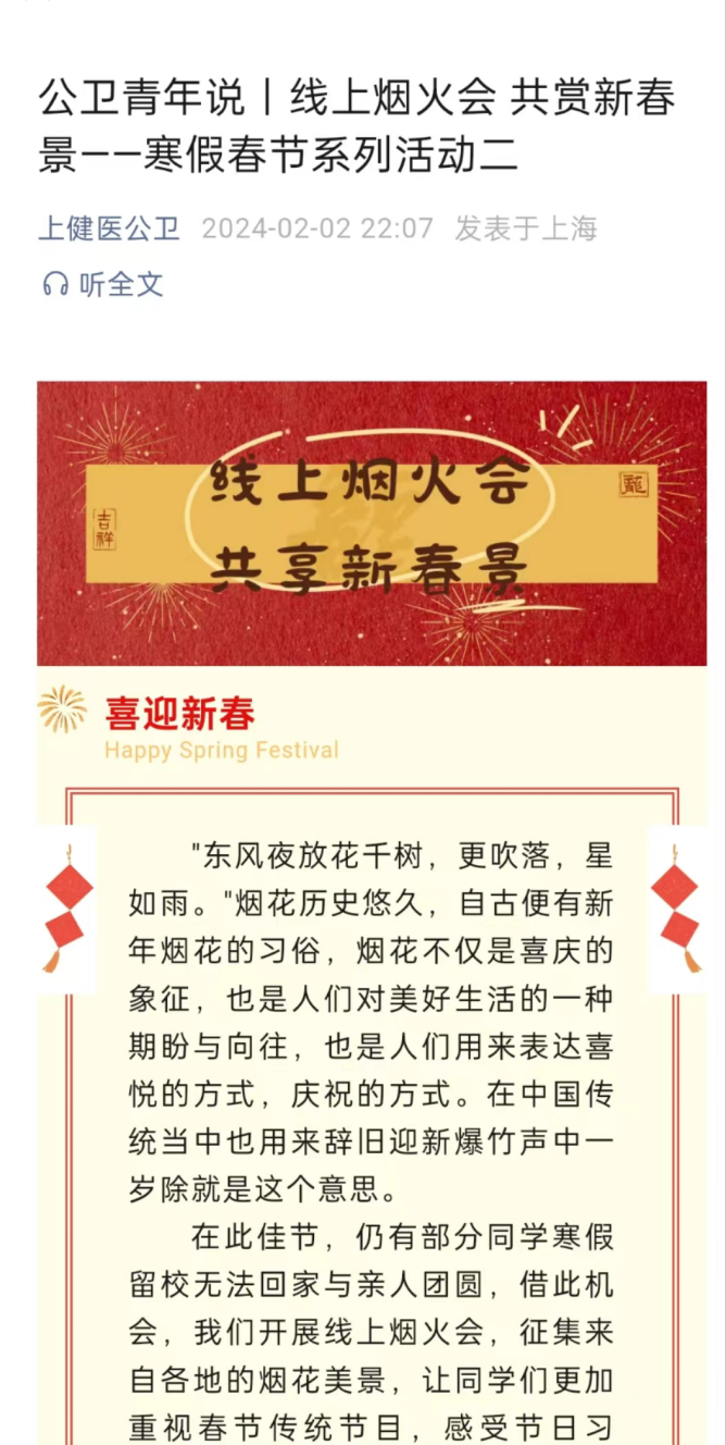 为使留校学生充分感受中国新年的欢乐与温馨,健康与公共卫生学院特开展了2024年寒假春节关爱留校学生系列活动。