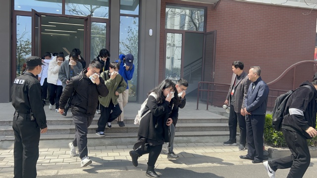 演练现场,工作人员模拟火情现场,楼层内设置“燃烧物”,模拟真实黑暗、浓烟、高温的环境。拉响消防警报,让师生“零距离”体验火灾逃生自救。模拟火灾发生后,工作人员第一时间组织师生有序疏散,维持疏散秩序,确保各安全出口畅通,引导学生快速有序地撤离到安全区域。整个撤离过程,师生用湿毛巾捂住口鼻,听从现场指挥,不互相推、拉,不争先恐后,有秩序地撤离,所有参加演练人员平安到达指定地点。