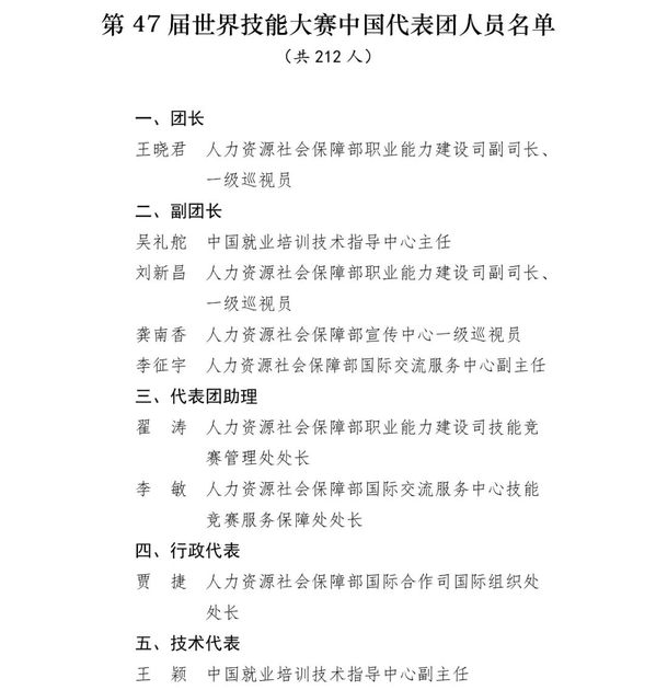 中国代表团由选手、专家、翻译、工作人员等212人组成。