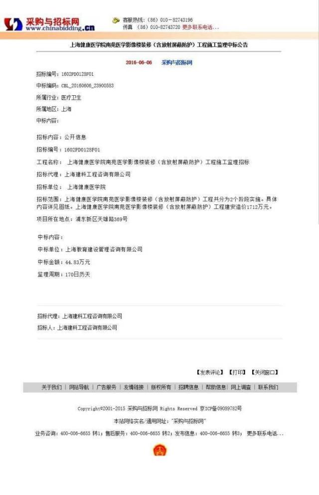 医学影像楼装修(含放射屏蔽防护)工程施工监理中标公告