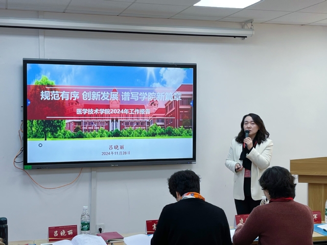 29位正式代表、2位特邀代表及5位列席代表齐聚一堂,共商学院发展大计。伴随庄严的国歌声奏响,大会正式开幕。医学技术学院党总支书记吕晓丽作了题为《规范有序 创新发展 谱写学院新篇章》医学技术学院2024年工作报告,全面回顾了一年来学院在教育教学、科研创新、人才培养等多方面的丰硕成果,并对未来发展作出科学规划与展望;工会主席陆俊杰随后作《医学技术学院2024年度工会工作报告》,详细阐述工会在服务教职工、促进学院和谐等方面的扎实工作与显著成效。全体代表全神贯注聆听报告,对学院党政、教代会、工会的辛勤付出与斐然成绩给予充分肯定与高度评价,现场气氛热烈。