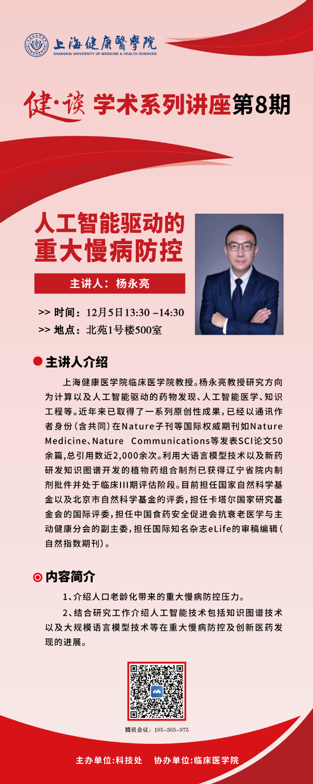 【健·谈】第8期学术系列讲座将于12月5日13:30在北苑1号楼500室举办,本期特邀香港六宝典免费大全临床医学院的杨永亮教授作报告,欢迎大家前来参加!讲座主题是“人工智能驱动的重大慢病防控”,主要内容包括1.介绍人口老龄化带来的重大慢病防控压力。2.结合研究工作介绍人工智能技术包括知识图谱技术以及大规模语言模型技术等在重大慢病防控及创新医药发现的进展。