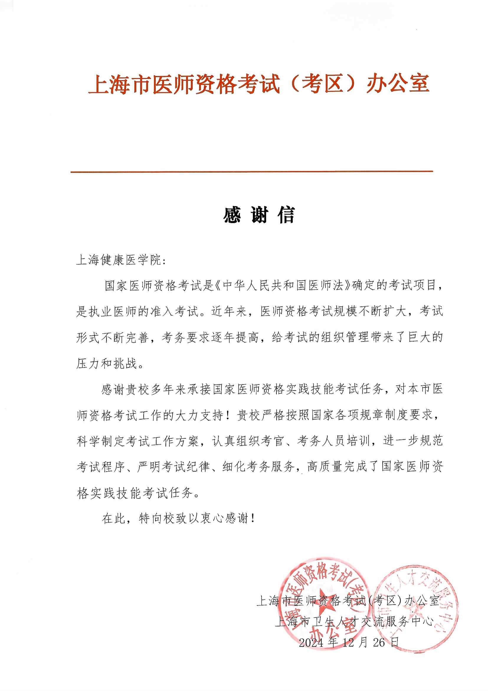 近日,我校收到上海市医师资格(考区)办公室的感谢信,信中肯定了我校实践教学中心在国家医师资格考试中的严谨组织、规范化流程以及高质量考核服务,并表达了衷心的感谢。