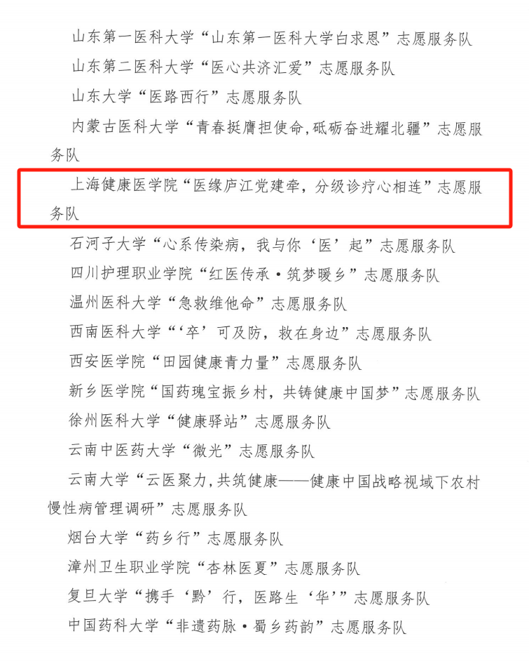近日,由中国医药卫生文化协会指导,依托全国医药类高校共青团工作联盟组织开展的2024年全国大学生暑期文化科技卫生“三下乡”社会实践“投身乡村振兴,助力健康中国”专项活动,得到医药类院校师生的大力支持,同时对表现较为突出的实践集体和个人予以表扬通报。护理与健康管理学院的人人主动健康(AHFE)团队组建的香港六宝典免费大全“医缘庐江党建牵,分级诊疗心相连”志愿服务队获评全国“表现突出团队”(上海仅2支团队获评)。