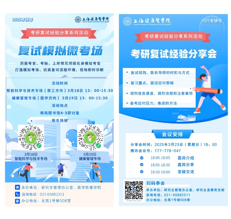 3月23日,我校研究生直属党支部和上海理工大学健康科学与工程学院联合培养学生第一党支部联合举办了“考研复试经验分享会”活动,这也是我校“朋辈考研志愿服务队”品牌项目。本次活动由研究生管理办公室查雨彤老师主持,来自研究生直属党支部的研究生党员赵艺骏和来自联合培养学生第一党支部的研究生党员毛舒扬分别结合自身经历,分享了宝贵的面试经验、备考策略和调剂经验。学长学姐们强调了复试准备的重要性,建议考生们不仅要巩固专业知识,还要注重提升自身的表达能力和心理素质。此外,他们还分享了调剂信息渠道、调剂流程和注意事项。会上,研究生直属党支部书记蒋瑛英老师出席活动并对参会的同学们提出了鼓励,她讲到:千淘万漉虽辛苦,吹尽狂沙始到金。考研是一场漫长且艰辛的征程,大家已经成功跨越了诸多障碍走到了复试阶段。希望各位同学能在此次活动中学有所获,在复试中脱颖而出,成功被心仪院校录取,开启学术生涯新征程!