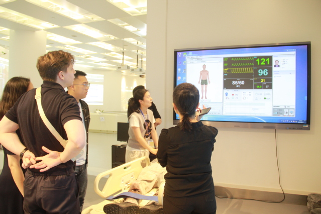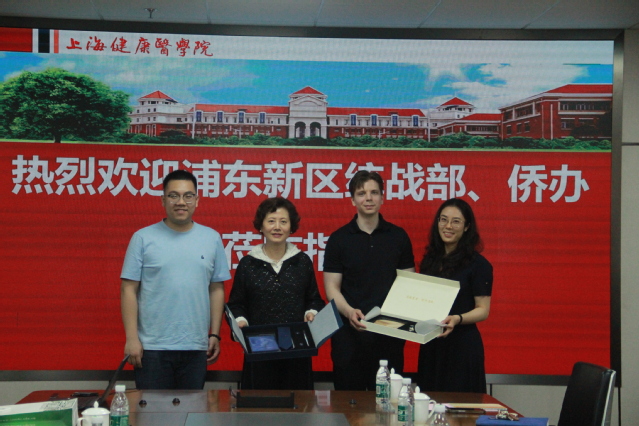 唐红梅向三位来访博士赠送学校纪念品。会后,侨务处一行参观了上海市智能医疗器械与主动健康协同创新中心和实践教学中心。