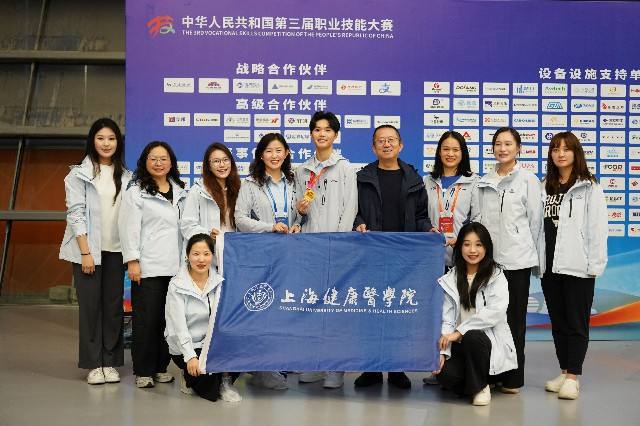 从2024年7月至今,闵思达的备赛之路步履坚实:最初以第48届世界技能大赛选手陪练身份参与训练,随后入选校级世赛集训队,历经2轮上海市选拔赛层层筛选,最终获得第三届全国职业技能大赛入场券。备赛期间,他始终秉持“打牢知识基础、苦练照护技能”的理念,日复一日的练习,累计使用的换药包数量远超常规训练量,每日数十次的消毒液洗手让双手出现明显色差。教练团队为其量身定制训练计划,为精准把握患者需求,他利用周末到病房与患者深度交流,倾听他们的心声;为优化男性照护者的服务特质,体现出更多的温暖和力量,在国外留学的师姐通过线上指导帮他打磨细节;为调整沟通时的微表情,他对着镜子反复练习神态与语气;为提升英语表达精准度,他每晚逐帧分析训练视频、推敲口语细节;为确保赛场稳定发挥,60天内针对12个案例完成上百次模拟展示与3轮全流程考核。金牌与荣耀背后,是无数个日夜的“错题式”打磨——将1%的瑕疵修正至0.01%的极致追求,最终换来了国赛领奖台上稳稳举起金牌的高光时刻!