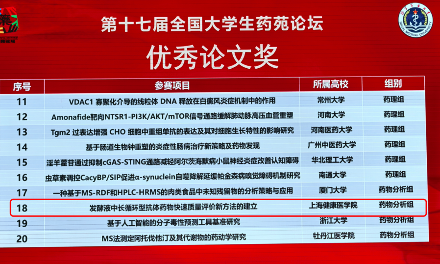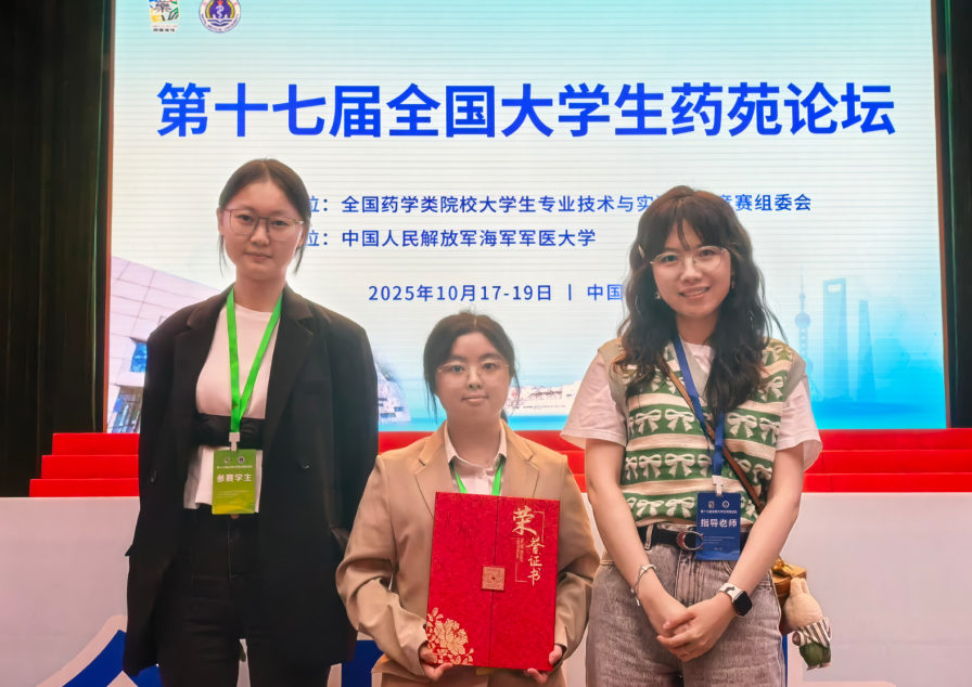 10月17日-19日,由全国药学类院校专业技术与实验技能竞赛组委会主办的第十七届全国大学生药苑论坛在海军军医大学举行。“药苑论坛”是全国高等教育药学类顶级赛事,本次论坛汇聚了全国药学领域的知名专家学者,共收到来自北京大学、复旦大学、四川大学、中国药科大学等126所高校的279项参赛作品,参赛高校和参赛作品数量均创历年新高。我校学子在此次大赛的激烈比拼中荣获创新成果一等奖,同时斩获优秀论文奖,这是继去年我校首获一等奖后的蝉联,充分展示了药学科学与药学服务领域的大学生创新创业成果和实践育人成效。