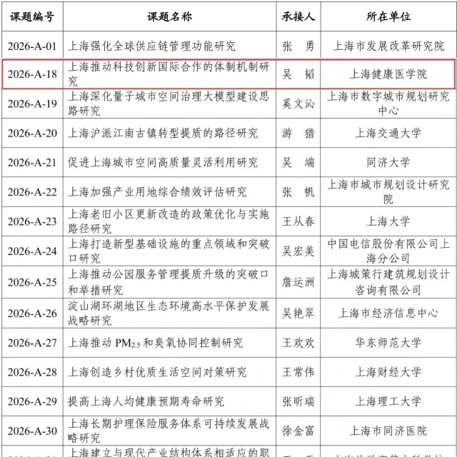 近日,上海市人民政府发展研究中心发布2026年度上海市人民政府决策咨询研究重大课题立项结果,我校吴韬研究员牵头申报的《上海推动科技创新国际合作的体制机制研究》成功入选,填补了学校该领域空白,再次彰显学校服务市委、市政府决策能力的显著提升。