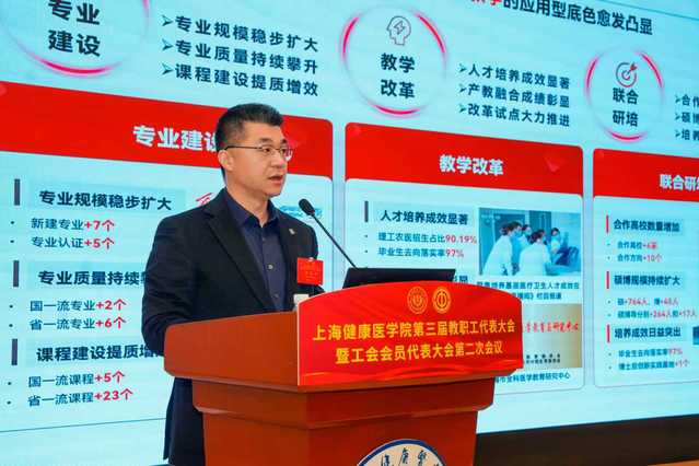 在庄严的国歌声中大会正式开幕。吴韬作学校工作报告,系统回顾了2025年全校各项工作成绩,并对2026年的工作进行了部署,他强调学校目前处在高等教育综合改革、教育科技人才一体化纵深推进和错位发展、特色鲜明的一流应用型医学院全面建设的关键阶段,必须始终坚定不移保持战略定力,增强必胜信心,遵循“先立后破、开拓创新、精进提质、实干争先”工作总基调,更加自觉地将各项事业发展置于强国征程的宏大场景中谋划推进,深化教育综合改革,围绕重服务、强贡献导向,不断提升为“科”服务,为“产”育人水平,加速实现内涵提质与能级跃升,奋力开创“十五五”规划建设新局面!