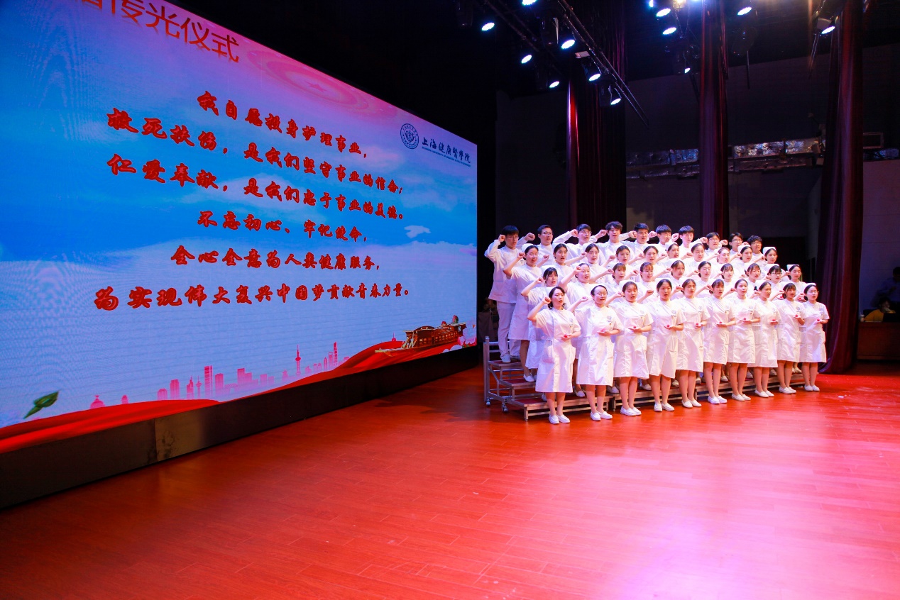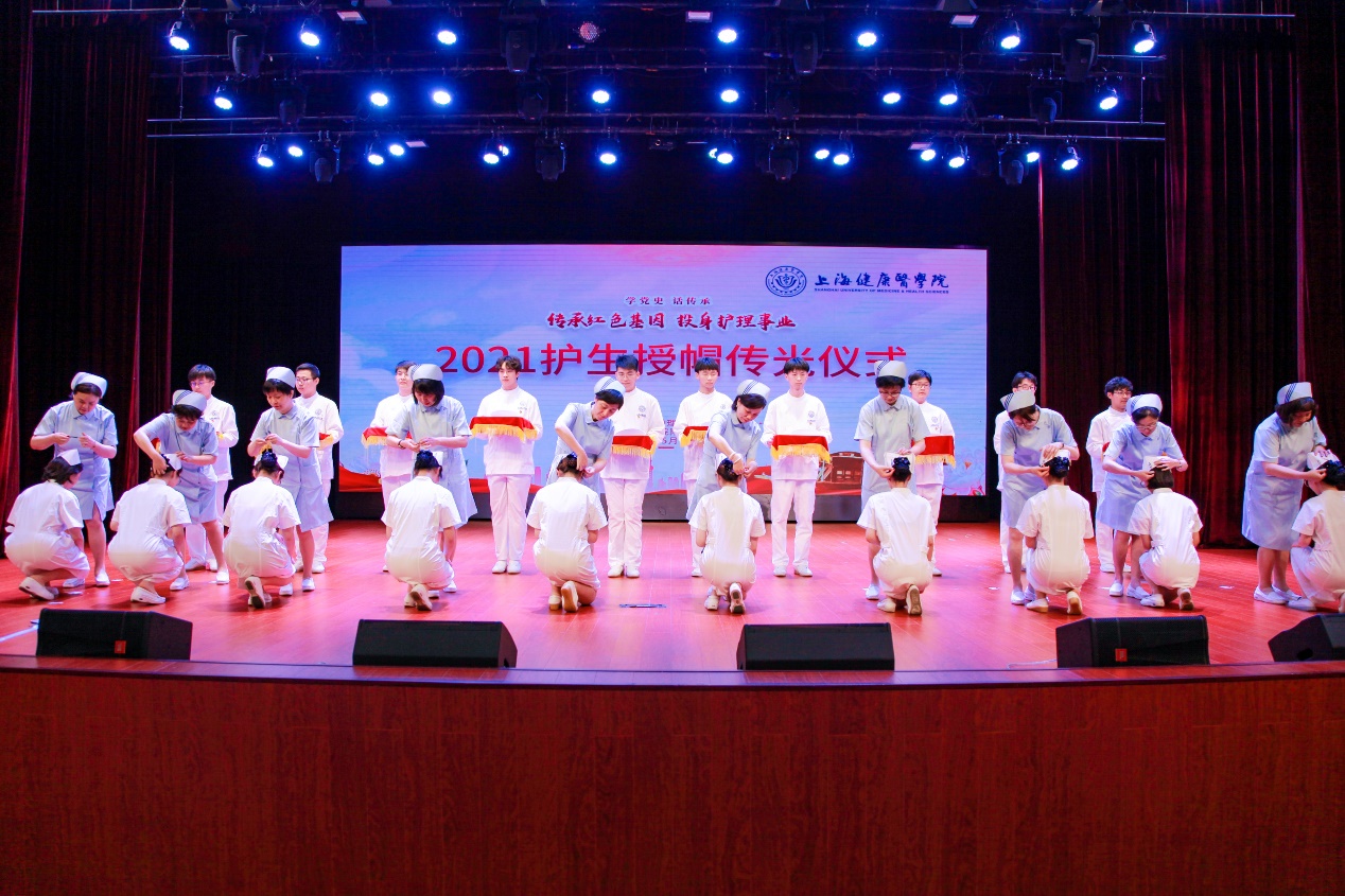接着,由上海市护理学会副理事长庹炎、复旦大学附属中山医院护理部副主任秦薇、上海交大医学院附属仁济医院护理部副主任陈敏、复旦大学附属华山医院护理部副主任任学芳、上海交大医学院附属第六人民医院护理部副主任董芳辉、同济大学附属东方医院护理部主任张伟英、复旦大学附属上海市第五人民医院护理部主任顾艳荭、上海交通大学医学院附属国际和平妇幼保健院护理部主任李红、上海市精神卫生中心原护理部主任曹新妹、上海市浦东新区周浦医院护理部主任汤培凤共同为即将走上实习岗位的400多名护生代表授帽。