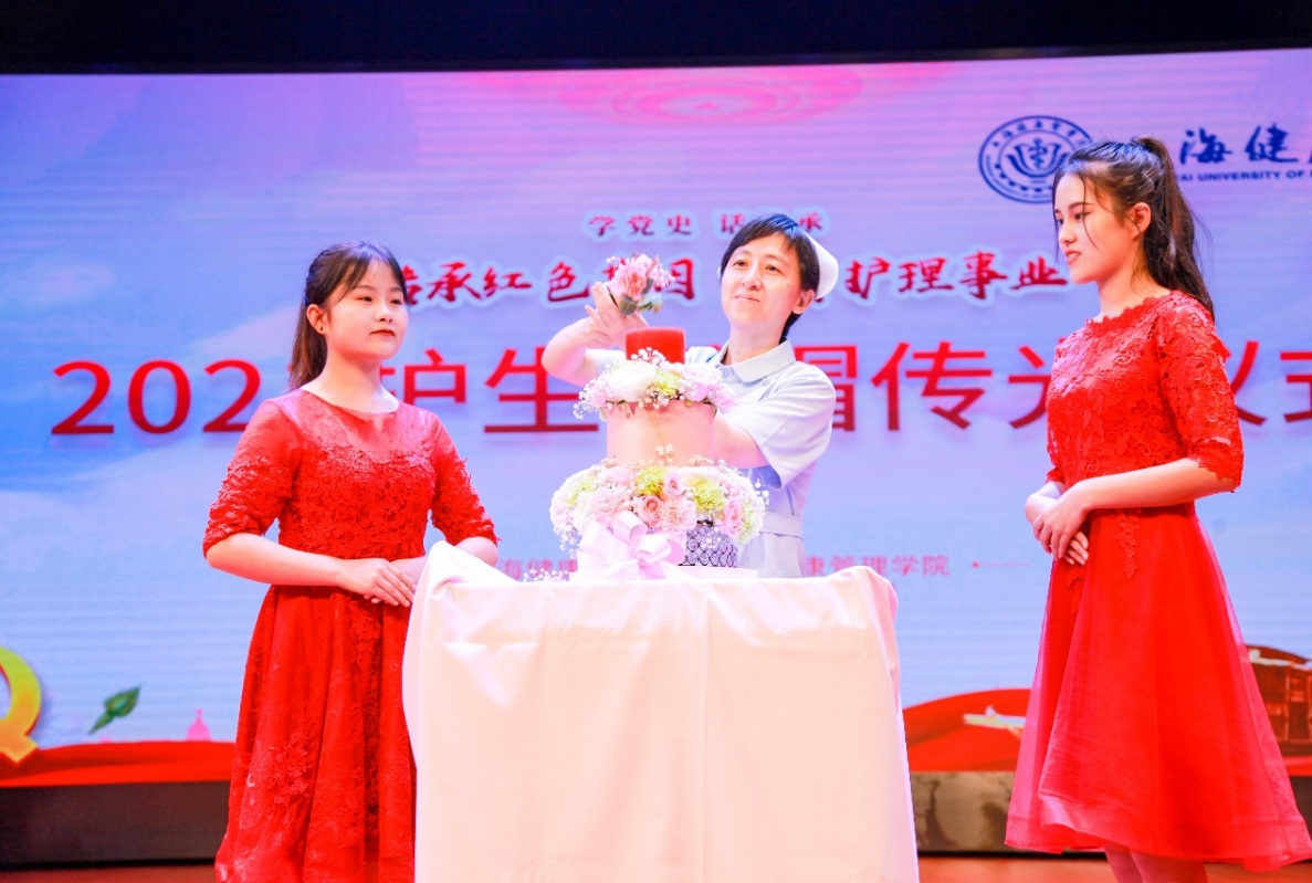 授帽传光仪式正式开始。上海市护理学会副理事长庹炎点燃象征生命之光的红烛,它是“点亮生命的航标,照亮前进道路”南丁格尔精神的象征。