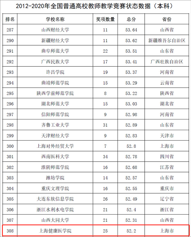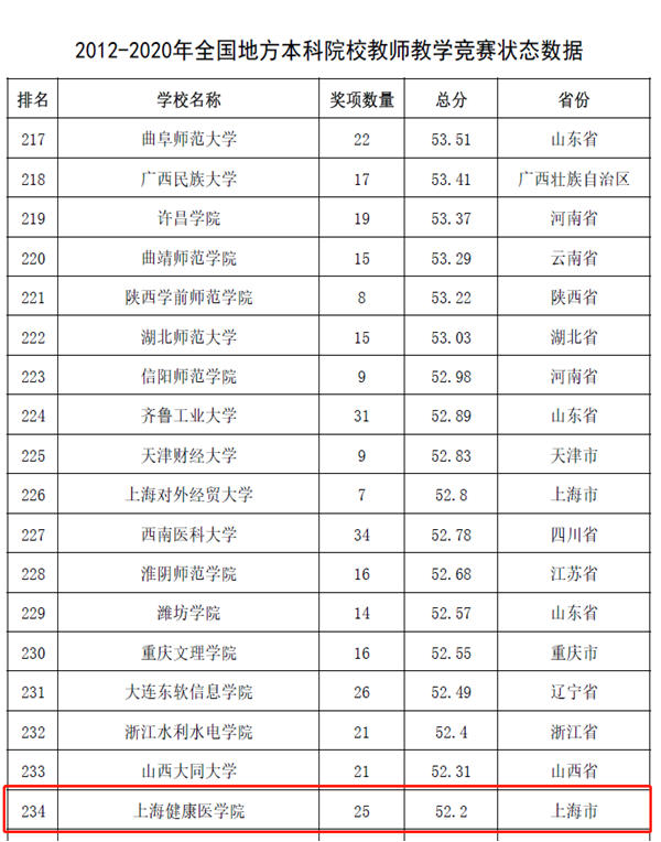 近日,中国高等教育学会发布《全国普通高校教师教学竞赛分析报告(2012-2020年)》。该报告以当前普遍得到社会认可且有公开数据的50项全国性高校教师教学竞赛作为研究对象,采用竞赛的“获奖贡献”和“组织贡献”作为评价指标,对教师教学竞赛现状进行了分析和研究。我校教师教学竞赛状态数据位于全国1006所本科院校前30.6%(308位),位于全国883所地方本科院校前26.5%(234位),上海市应用技术型高校第一。
