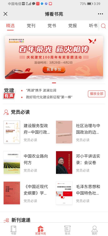 2、点击底部菜单栏“我的图书馆—百年荣光”,进入党建云阅读平台,点击首页活动轮播图,进入活动页面浏览党的百年历程大事件。