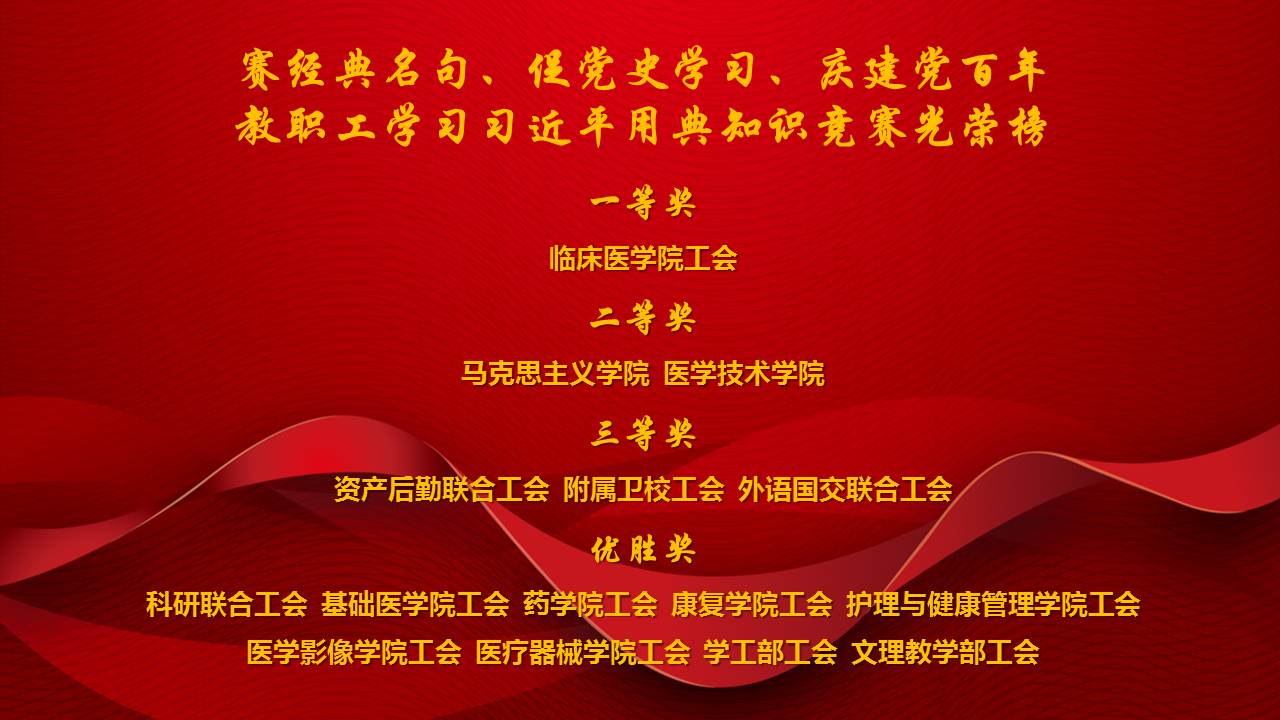 赛前选手们积极备战,认真学习习近平总书记系列重要讲话中的用典知识,用心理解体会其深刻内涵。赛场上,各个队伍积极作答,紧张有序,现场气氛活跃,频频快且准地按下抢答器,充满自信地应答每一条用典知识,引来场内观众的阵阵欢呼,还不时为选手的精彩回答鼓掌喝彩,参加活动的每一位教职工浸润在中华民族传统文化的海洋中,感受着习近平新时代中国特色社会主义思想理论精髓和治国理政的睿智。最终临床医学院工会荣获一等奖,马克思主义学院工会、医学技术学院工会荣获二等奖,附属卫校工会、外语国交联合工会、资产后勤联合组工会荣获三等奖。还有九个学院代表队获得优胜奖。同时经过评委们的商议确定,推荐临床医学院的牛静雅、医学技术学院的胡长沙2位教师代表学校参加上海市教育工会的复赛,预祝选手们再创佳绩。