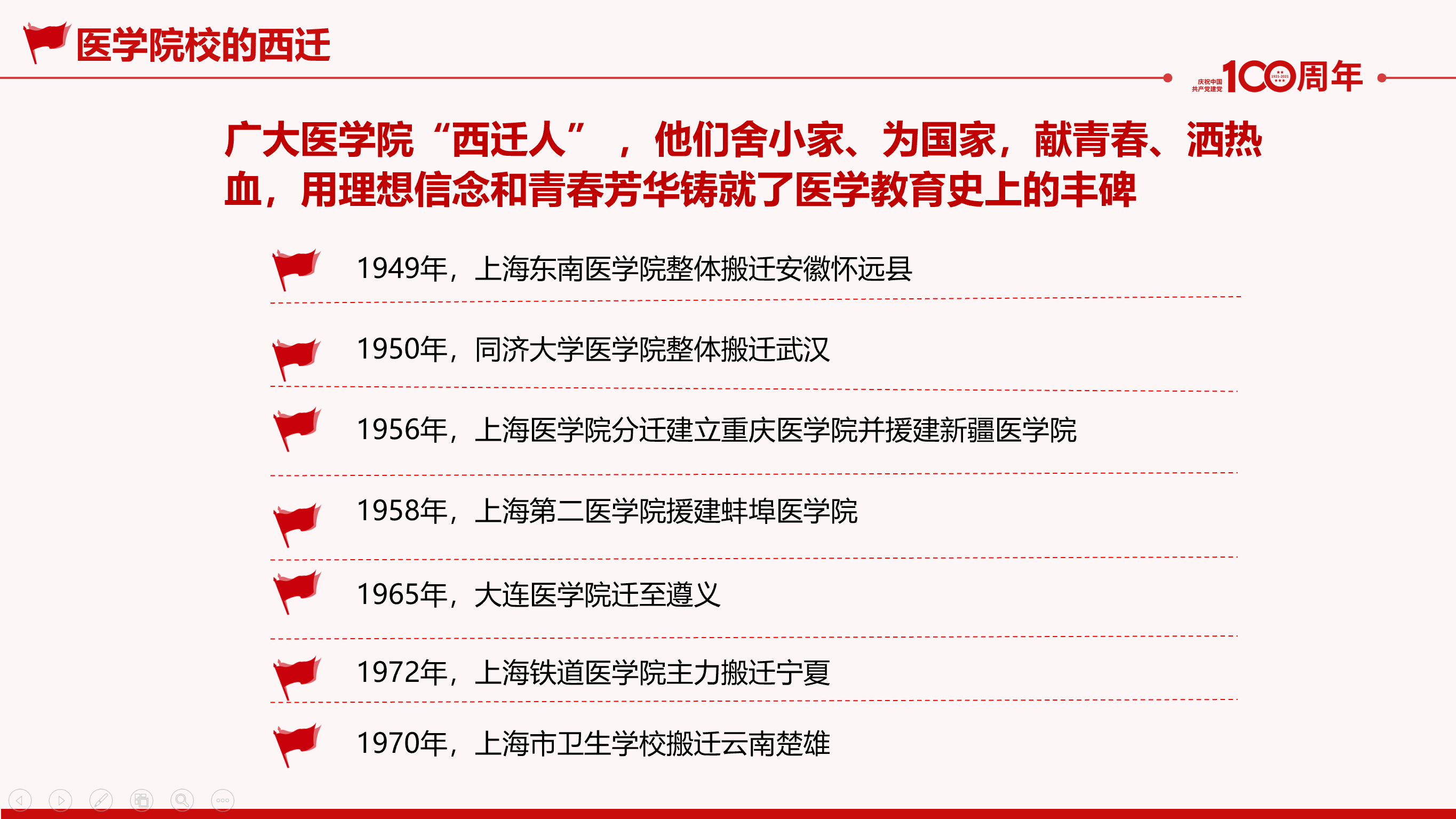 吴韬介绍了新中国成立后全国医学院校的西迁之路,其中包括香港六宝典免费大全前身的上海市卫生学校西迁的相关历史和重要意义。他总结道:无论是“西迁”还是“西援”都是西迁精神的传递,今天的援疆、援藏和志愿者活动也是“西迁精神”的当代传承和生动写照。去年,在抗击新冠肺炎疫情过程中,我校共有262位校友参与了武汉抗疫,他们就是西迁精神的当代缩影。学校自组建以来,在西部地区建立附属医院、选派干部、支援教师、订单培养、招收少数民族预科生,对口支援新疆喀什、云南昆明等地,为祖国西部发展贡献力量,也是西迁精神的弘扬。
