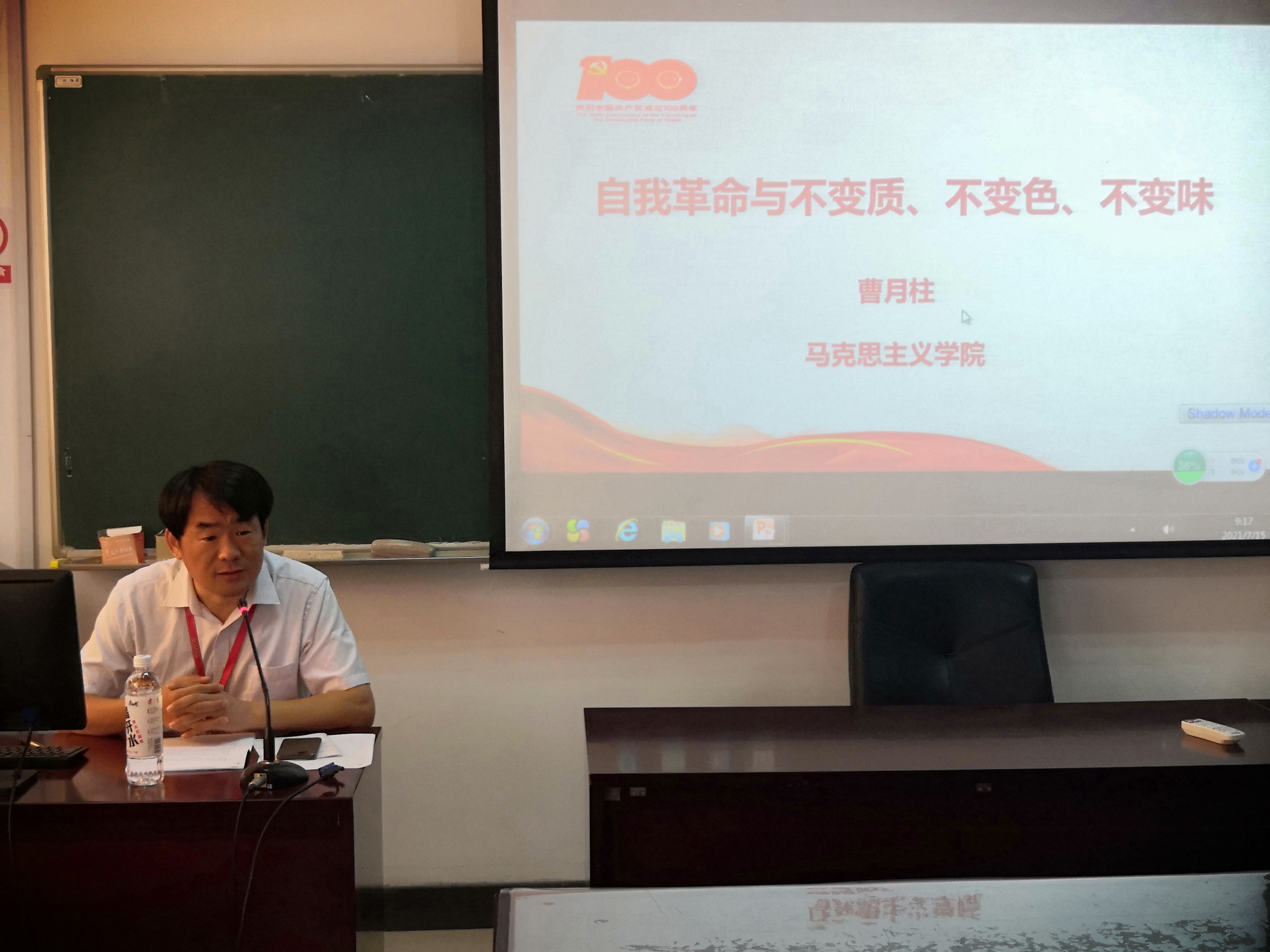 曹月柱从“回顾百年历程,坚定‘四个自信’”、“牢记历史结论,坚定地走自己的路”、“推进理论创新,引领伟大复兴征程”、“加强党的建设,走好新的赶考之路”4个方面,用朴素的语言、大量的史实案例、古今中外的对比,带领老师们重温历史,回望来路,铭记初心,使大家感受到中国共产党的百年光辉历史和伟大成就,对美好未来充满希望和信心。他还以延安“十没有”、“铁纪委”陈云的反腐风暴等材料,重点讲解了中国共产党保持先进性、纯洁性的强大武器就是自我革命,就是要增强全面从严治党永远在路上的政治自觉,为此要做到三个必须:必须坚持党的坚强领导、必须坚持党的全面领导、打铁必须自身硬;坚守三个不变:不变质、不变色、不变味(“一个继承两个消除”);做到三个始终:始终走在时代前列、始终成为全国人民的主心骨、始终成为坚强领导核心。