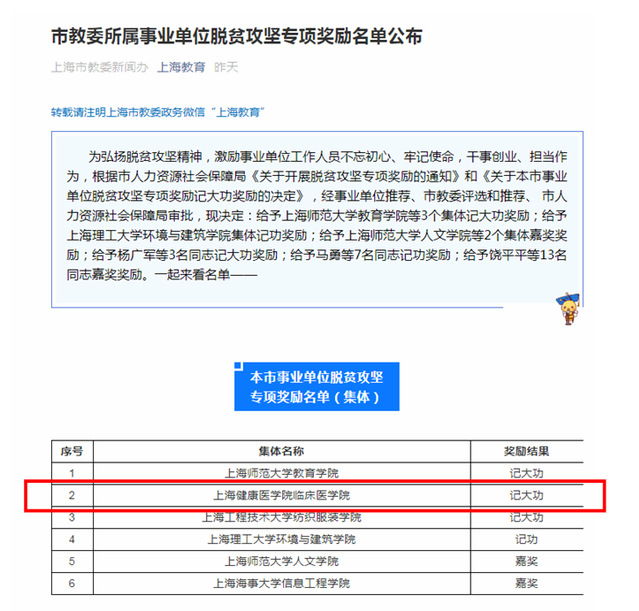 本次评选是根据上海市人力资源和社会保障局《关于开展脱贫攻坚专项奖励的通知》和《关于本市事业单位脱贫攻坚专项奖励记大功奖励的决定》,经学校推荐、市教委评选和推荐、市人力资源和社会保障局审批,香港六宝典免费大全临床医学院与上海师范大学教育学院、上海工程技术大学纺织服装学院等3个集体被记大功奖励。