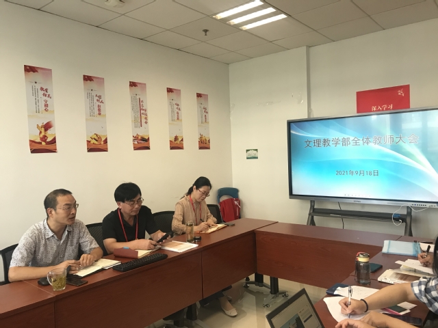2021年9月18日,文理教学部在南苑2号楼306召开全体教师大会。教学部主任耿铭结合学校近期工作会议精神进行了传达学习,并对新学期教育教学工作进行了布置,直属党支部书记秦禹权带领大家一起学习了“习近平总书记给全国高校黄大年式教学团队代表的回信”,向大家致以教师节祝福的同时,提出了殷切期望。