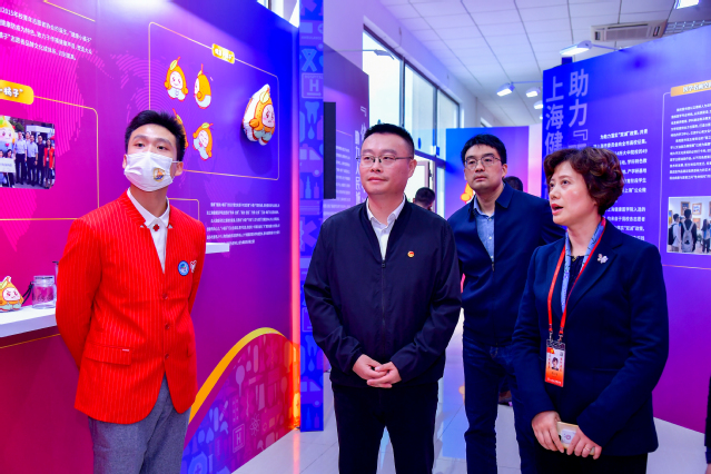会场入口,展出了历年“健康小叶子”的进博回忆。我校志愿者在历届进博会中,各个岗位上的志愿者服务精彩瞬间。介绍了我校进博会志愿者“市、校、院”三级培训的传统;展示了“健康小叶子”的专属进博会医疗急救包,历届进博会志愿者激励徽章。同时,回顾了近年来学校青年志愿者工作,“健康小橘子”品牌及文创产品介绍、助力“双减”行动项目简介、抗疫志愿者系列事迹、金晖为老志愿服务风采和各优秀志愿服务团队介绍。