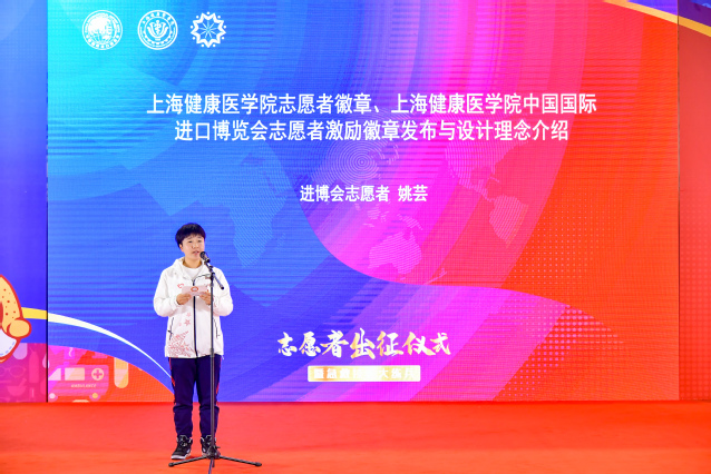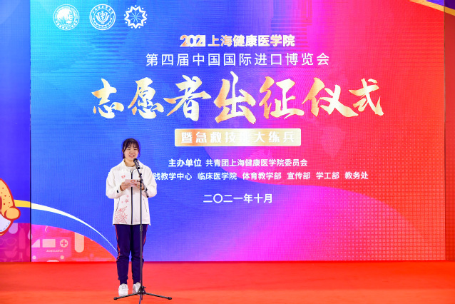 医学技术学院19级学生陈子同学作为本届进博会志愿者代表发言,她表示所有“健康小叶子”已整装待发,将不负学校所托,向社会展现健康学子的使命担当,向党和国家展现健康学子的坚定决心,向世界展现健康学子的志愿风采。