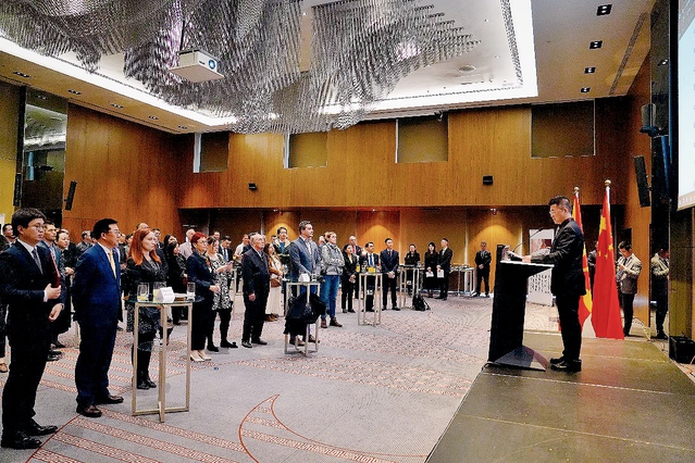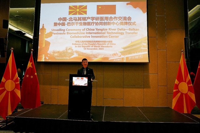 11月18日,驻北马其顿使馆举办中北马政产学研医用合作交流会暨中国—巴尔干生物医药协同创新中心揭牌仪式,张佐大使、斯科普里副市长特拉亚诺夫斯基、校长吴韬、奥赫里德信息和科技大学代表马宁诺等出席并致辞,多地市长、中北马企业、高校、媒体等各界代表170余人出席。张大使表示,中北马双方将在两国领导人战略引领下,共同促进政产学研医用一体化发展交流合作,使发展成果更多惠及两国人民。特拉亚诺夫斯基盛赞中国式现代化成就,欢迎更多中国高校、企业与北马开展合作。吴校长表示,学校愿加强与北马教育、科技合作与交流,积极推进中国长三角和巴尔干半岛在生物医药等领域对接。来宾们共同见证了中国长三角—巴尔干半岛生物医药国际技术转移协同创新中心揭牌仪式。