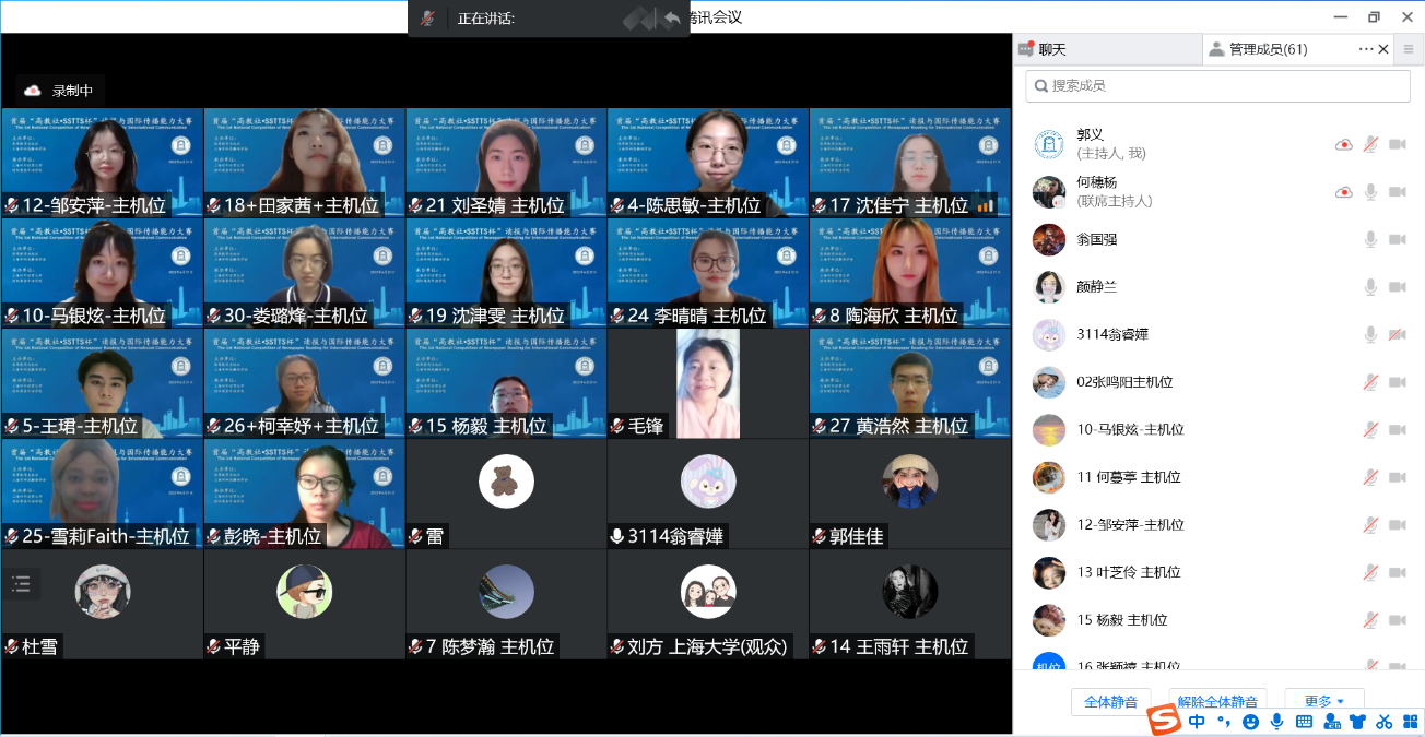 本次大赛面向全国高校在校全日制本科生、研究生和爱好读报的社会人士,不限国籍,旨在培养我国大学生扎实的英语语言基础、跨学科知识和人文科学知识,培养具备各领域国际交流能力、能够讲好中国故事的高素质复合型人才。本次大赛形式新颖,为国内首个将读报与国际传播相结合的大型赛事。初赛收到了来自全国近80所高校的500余名本科生和研究生作品,此外,大赛还收到了部分社会人士和留学生投稿。经过初赛评委严格筛选,最终30位选手脱颖而出,进入决赛。我校选手沈佳宁、王珺、柯幸妤和杨毅在决赛环节中发挥出色,同来自华东政法大学、上海交通大学、南开大学、华东理工大学、东华大学、暨南大学等选手同台竞技。其中,沈佳宁凭借在读报比赛中对《中国日报》上《Shedding Light on Chinese Shadow Puppetry》一文独到的解读,获得了评委们的青睐。主评委颜静兰教授认为该学生对现象和问题进行批判性思考并提出自己的见解,而非一味地陈述。她尤其深刻地理解中华优秀传统文化的当代价值和时代意蕴,展示中华民族的独特精神标识,可圈可点。中国日报21世纪英语教育传媒上海分部主任刘辉先生认为,该学生现场表现突出,让英语不再局限于成为一种交流的工具,完美地体现了他们这一代大学生专业素养和国际传播能力。