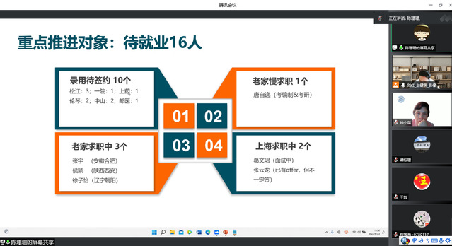 会上,党总支副书记乔慧敏从就业工作进展情况、就业工作面临的难题、目前采取的具体措施三个方面,对学院的整体就业情况进行了介绍。她表示当前疫情之下就业形势严峻,学院上下凝心聚力,精准施策,坚持一人一策,始终把就业工作作为重中之重,坚定保就业的决心和信心。毕业班辅导员从班级就业情况、近期工作、工作困难、工作计划等方面对各自班级情况进行汇报,在汇报过程中着重对未就业毕业生的求职进展进行了交流,同时就学生在就业中遇到的问题进行沟通。随后,教研室主任进行发言,表示会加强教研室研讨和责任落实,利用一切可以利用的资源,尽全力推进就业工作。