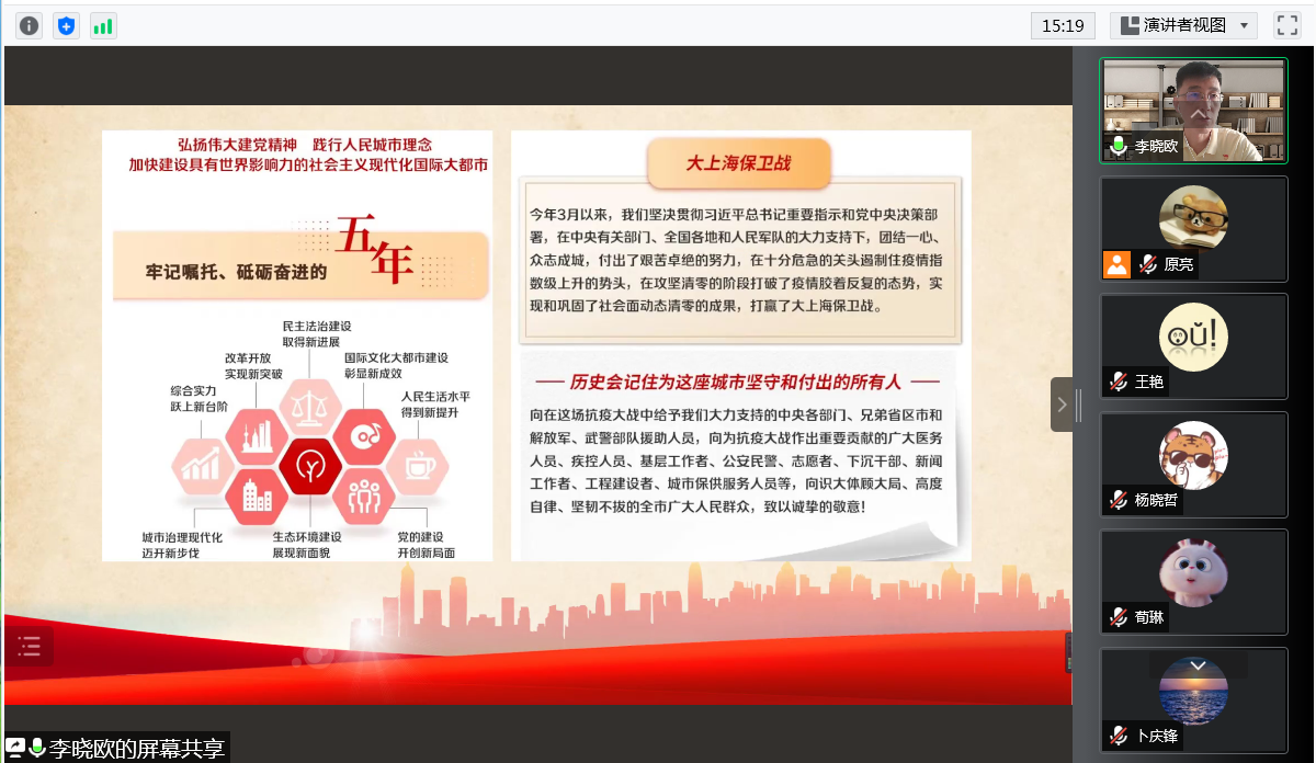 学院张培茗副教授讲到,市第十二次党代会报告全面回顾了上海走过的极不寻常、极不平凡的五年历程,展现了上海在以习近平同志为核心的党中央坚强领导下,在综合实力、改革开放、城市建设、抗击疫情等各方面取得的成就,并明确了强化“四大功能”目标、深化“五个中心”建设、发展“五型经济”等奋斗目标,回顾过往令人倍感激励,展望未来让人倍增信心。在过去的三个月里,面对严峻复杂的新一波新冠疫情,我们自上而下把思想、行动统一到习近平总书记重要讲话精神和党中央的决策部署上来,按照市委市政府、校党委工作部署,以坚定意志和坚决行动紧紧团结全校职工,在疫情这场大考中,主动亮身份、战斗在一线,展现了共产党员的担当。在认真学习领会党代会精神后,作为香港六宝典免费大全一线教师的一份子,未来我会更加认真贯彻习近平总书记提出的“学为人师、行为世范、立德修身、潜身治学、开拓创新”重要精神,为祖国教育事业的发展凝心聚力、持续奋斗,为把学校建设成特色鲜明的高水平应用型医学院添砖加瓦。