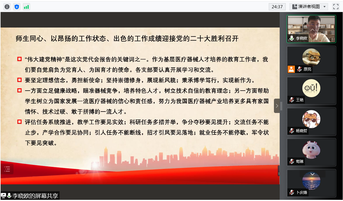 7月2日,医疗器械学院党总支通过线上组织召开中心组(扩大)会议,专题学习贯彻市第十二次党代会精神,学院党总支委员、各党支部书记、团总支书记、教研室主任、科级干部、工会主席及各党支部委员等参加会议,会议由学院党总支李晓欧书记主持。