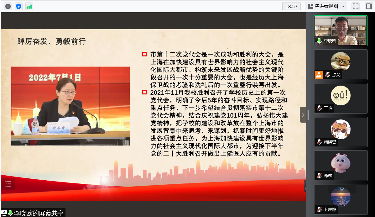 接着,李晓欧传达了7月1日校党委理论学习中心组(扩大)学习会精神,校党委郭永瑾书记指出“2021年11月我校胜利召开了学校历史上的第一次党代会,明确了今后5年的奋斗目标、实现路径和重点任务,下一步希望结合贯彻落实市第十二次党代会精神,结合庆祝建党101周年,弘扬伟大建党精神,把学校的建设和改革放在整个上海市的发展背景中来思考、来谋划,抓紧时间更好地推进各项重点任务,为上海加快建设具有世界影响力的社会主义现代化国际大都市,为迎接下半年党的二十大胜利召开做出上健医人应有的贡献”,吴韬校长强调“学习宣传贯彻市第十二次党代会精神,是当前和今后一个时期的重要政治任务。全校师生要深刻理解和准确把握市第十二次党代会的精神实质,以强烈的政治责任感和使命感认真学习领会,深刻理解把握,精心谋划部署。我们要以‘时时放心不下’的责任感,知重负重、坚韧不拔,向最好者看齐、与最强者比拼、跟最快者赛跑,加快推进学校教学科研等各项工作快速发展,为大踏步推进高水平应用型医学院校建设贡献力量,以实际行动和优异成绩庆祝建党101周年和迎接党的二十大的胜利召开”,这激励着学院教师要踔厉奋发、勇毅前行。