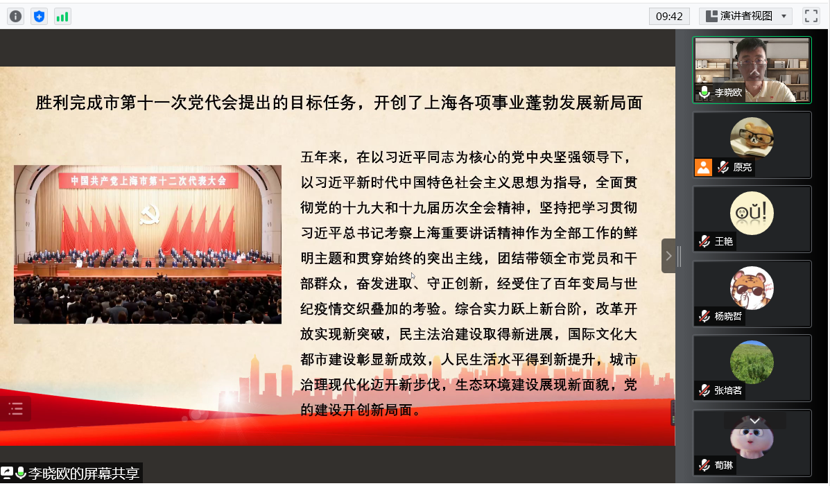 首先,李晓欧领学李强书记的报告《弘扬伟大建党精神 践行人民城市理念 加快建设具有世界影响力的社会主义现代化国际大都市》。“奋斗充满艰辛,成就令人鼓舞”,牢记嘱托、砥砺奋进的五年所取得的成绩、两年多来抗疫斗争的实践特别是大上海保卫战,使我们更加深刻地认识到,中国特色社会主义具有无可比拟的制度优势;“实干成就事业,奋斗创造未来”,上海已按下加快建设具有世界影响力的社会主义现代化国际大都市按钮,明确重点任务、抓住关键环节,以各领域各方面的工作突破开创事业发展新局面;伟大建党精神是中国共产党的精神之源,为立党兴党强党提供了丰厚滋养,以伟大建党精神引领新时代党的建设新的伟大工程。