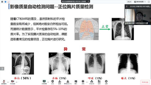 本次活动由孙九爱副教授和黄清明博士进行课题分享,孙老师以《正位胸片质量自动检测方法的研究》为题,针对医学影像摄片质量自动检测问题,采用深度学习方法对胸片中的异物和摄片体位进行自动估计。该技术能够有助于评估放射技师摄片质量,改善摄片技术规范化程度,提高检查效率,具有重要的临床应用价值和示教研究意义。黄老师则结合自己的教研经验,以《多核磁共振成像关键技术与研究进展》为题,从传统氢核磁共振成像原理和功能部件结构出发,围绕多核磁共振成像的磁体系统、射频系统、梯度系统、谱仪系统、计算机系统和超导低温保障系统等核心关键技术,以及应用该技术在人体肺部和体内钠离子检测等方面开展的相关研究进行了介绍,深入探讨了多核磁共振检查技术的临床价值、图像质量改善和扫描时间优化等方面亟待解决的科学问题。
