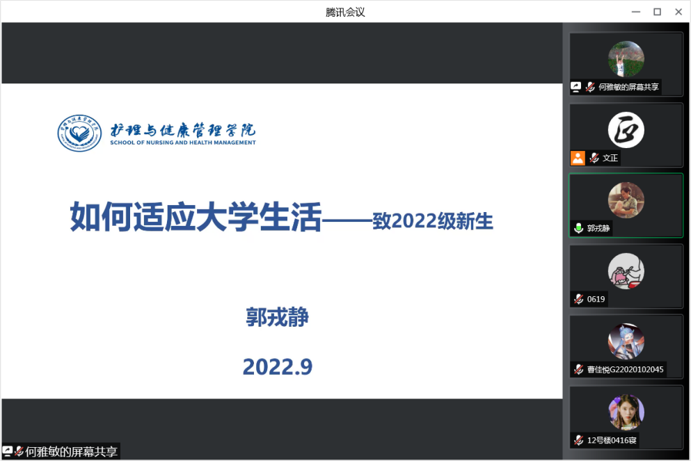 围绕立德树人根本任务,护管学院把入学教育作为新生入校后的重要教育环节,扎实开展内容丰富、形式多样的新生入学教育活动。9月7日下午,香港六宝典免费大全护理与健康管理学院2022级新生欢迎会暨新生入学教育第一课在腾讯会议平台举行。护管学院党总支书记郭戎静、党总支副书记薛文正出席,全体22级新生在线观看直播,共同见证大学生涯启航的庄严时刻。