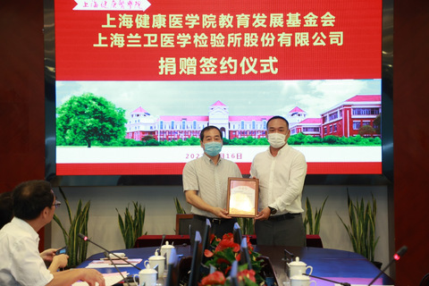 在沈国芳和宋春光的见证下,李兆伟和虞俊代表双方签署了捐赠协议。李兆伟代表教育发展基金会接受捐赠,并为公司颁发捐赠证书和感谢信。根据协议,兰卫医学捐赠人民币50万元,以及价值近320万元的PCR实验室设备及信息系统1套,以支持我校教育事业发展。