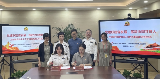 为扎实推动学习贯彻习近平新时代中国特色社会主义思想主题教育高质量开展,2023年6月21日,上海市医疗急救中心科室第一党支部与临床医学院党总支第二党支部举行“党建联建谋发展,医教协同共育人”主题教育联组学习暨党建联签约仪式。校党委常委、组织部部长汤磊,上海市医疗急救中心党委副书记、纪委书记顾丽萍,临床医学院党总支书记、院长蔡巧玲,上海市医疗急救中心副主任袁明,临床医学院党总支副书记罗瑾琰等出席签约仪式。会议由蔡巧玲主持。