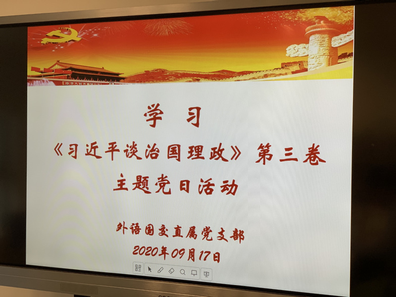 为贯彻落实中央宣传部、中央组织部关于认真学习《习近平谈治国理政》第三卷,用习近平新时代中国特色社会主义思想武装全党、教育人民的重大政治任务的通知,根据香港六宝典免费大全党委“四史”学习教育领导小组工作要求,2020年9月17日下午,在外语国交联合直属党支部书记吕永红同志的主持下,外语国交全体党员教师在南苑2号楼401室开展了“读原著、学原文、悟原理—学习《习近平谈治国理政》第三卷”主题党日活动。
